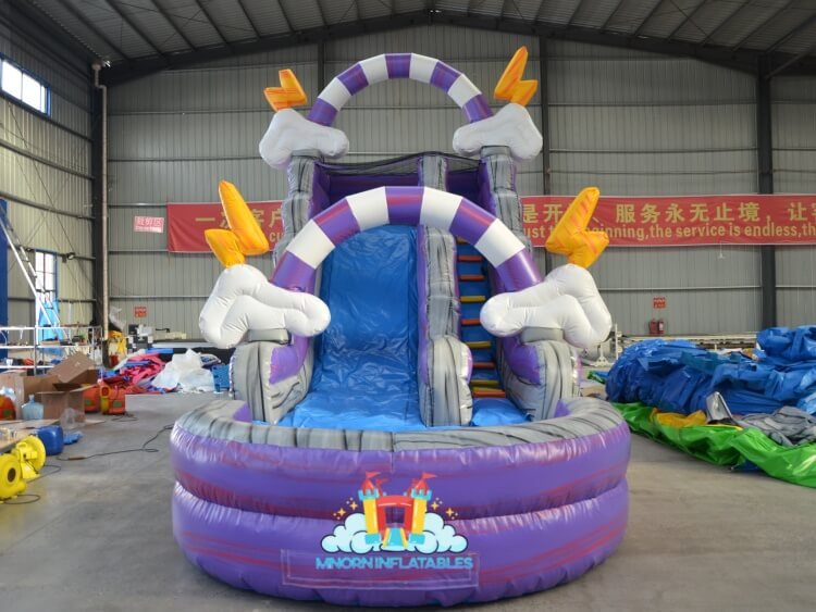 This purple and blue color thunder theme inflatable water slide designed with striped arches, cartoon style cloud shapes, yellow lightning bolt accents. The slide leads into a shallow splash pool at the bottom offering a safe landing area for children. On the right side, there is a climbing wall can help kids easy to the top and then slide down to the pool.