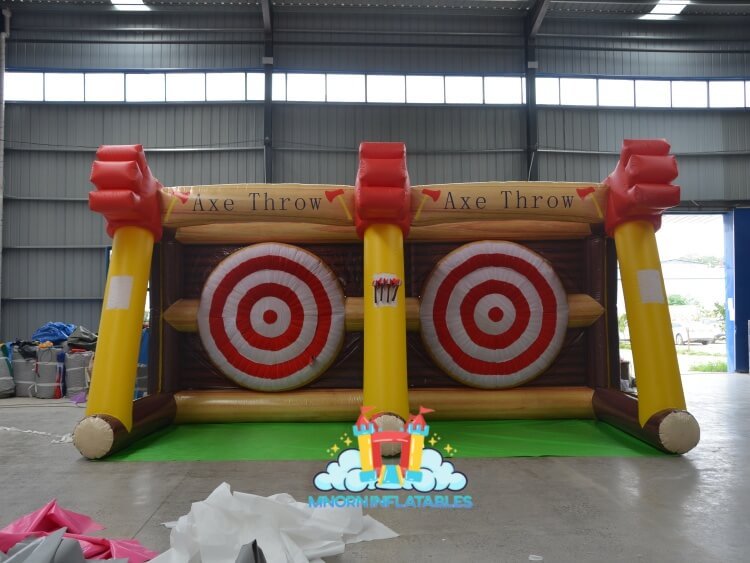 An inflatable axe throwing game is a portable, air-filled game structure designed to simulate the experience of traditional axe throwing — but in a safe and fun way, using soft Velcro axes and a PVC target. How It Works: 1. Players take turns throwing the Velcro axes at the inflatable target. 2. Points are scored based on where the axe lands on the target. 3. The game can be played competitively or just for fun.